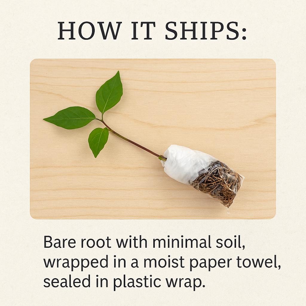 -Your plant will be shipped bare root with minimal soil, wrapped in a moist paper towel and sealed in plastic wrap to retain moisture during transit. We package each order carefully to ensure it arrives healthy and ready to plant. Upgrade to a fully potted plant here:https://www.etsy.com/listing/4316929386/add-on-ship-my-plant-in-pot-soil-upgrade